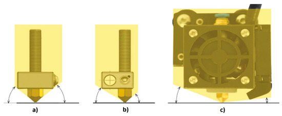 The shape of the head and nozzle of the device Anet E12 (a) 42° both sides, (b) 45 and 34°, (c) 12 and 23°.