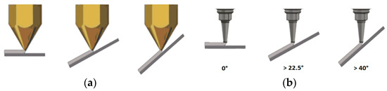 Another problem is the shape of the print nozzle itself. Unlike blowers and other printhead components, they cannot be removed or moved. As shown in Figure 7, the shape of the nozzle itself is also limiting in creating non-planar surfaces. One possible solution is the use of the so-called “Airbrush” nozzle, which consists of a sharp tip. It increases the overhang angles that the print head can copy. With these modifications, it is possible to achieve a significant increase in FDM devices’ efficiency when printing non-planar surfaces. However, these adjustments have their limits. This limit is the very fact that the print nozzle’s ideal position during the extrusion of the material is perpendicular to the surface of the model being created, within the solution of this problem described in the already mentioned in patent application No. US10005126B2. A critical limit is the stated value in the range of 22.5°–45° depending on the direction of the print head movement [10]. It follows that, in order further to increase the efficiency of non-planar layering of material, a device is required whose design allows the printhead to be tilted partially [18].