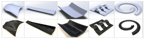 Figure 9 shows different types of non-planar surfaces formed by a robotic arm. Their basic idea is to create a non-planar base copying the surface of the support model. Instead of the usual Infill, i.e., the percentage value of the filling known from the creation of models by FDM devices, a planar laminated plastic is used in this case. The one already mentioned serves as a support for the upper non-planar surfaces.