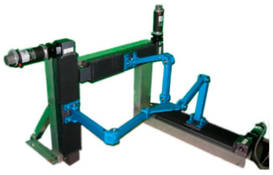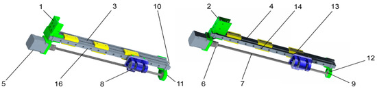 During the structure’s design process, we did not work only with static models, as was interpreted in the deformation shown in Figure 12, Figure 13 and Figure 14, but we also used the so-called motion analysis. Due to the arms’ arrangement, the types of lines used and the possible negative phenomena resulting from the individual subsystems, the static analysis alone was insufficient. The device is divided into several smaller subsystems, which reduced the time required for each analysis run. One of these subsystems was also the already mentioned X-axis line, together with its key component. The whole part of the construction was used for the simulation itself, as shown in Figure 15.