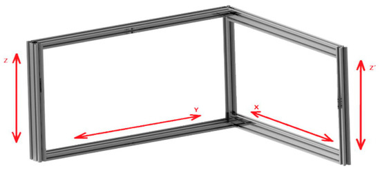 The device’s frame is made of aluminium profiles measuring 20 × 20 and 20 × 40 mm. The orientation of these profiles is adapted so that, due to the device’s complicated kinematic, there are no collisions of the arms and carriages in the individual axes, with the frame of the structure (Table 1). Another influence on the orientation of the profiles is also used by the used connecting parts, i.e., clamps, which ensure the mutual position of individual shapes and ensure the whole frame’s stability.