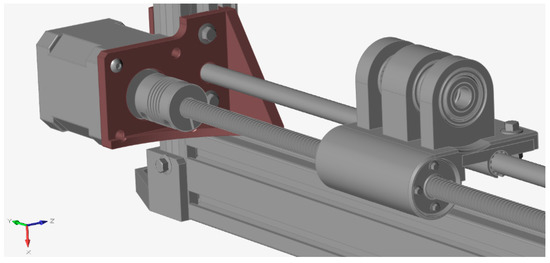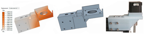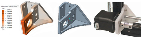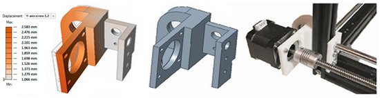 The construction of FDM devices is relatively undemanding. The models have been adapted to be fixed using simple connections of M3 screws and “T” matrix. Various variants of corner brackets served as setting elements for the frame of the structure. The device was designed so that its assembly requires minimal interventions in the frame structure. In connection with the assignment’s solution, a virtual model of the whole assembly and all components was created. The body of the system itself was relatively simple. The use of fasteners and individual elements in a predetermined location on the frame was seamless. The negative factors were the assembly of plastic parts with the help of screw connections, the mechanical properties of the materials used and the deviations of the equipment used to produce components. When mounted on a metal frame, they caused the plastic element to deform. Other negative effects were shown during the commissioning of individual axes. These negative factors, extremely complicating the design of the structure itself, caused the accumulation of large amounts of plastic waste, which resulted in the need to recycle the failures. The critical components were the bearings of motors, drives and lead screws, which can be seen in Figure 12 and Figure 13. Modifying these designs using the finite element method greatly accelerated this process and reduced the amount of plastic waste generated, resulting from the high failure.