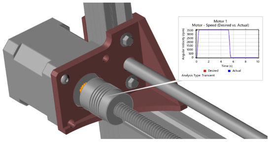 After defining all the connections and supplementing the structural elements such as screw connections and bearings from the library of the used program, the location and type of electric motor used were defined. The advantage of this type of analysis is that it is not necessary to explain all the factors operating on the subsystem. The definition of these factors results from the CAD model itself, the relationships between the individual components, the selected types of materials, etc. The starting curve of the electric motor (Figure 16) during the analysed load is decisive for us. This was adjusted according to the assumed operating parameters of the proposed FDM device. In Table 4, we can see the individual parameters defining the course of simulation of the subsystem motion and its analysis.