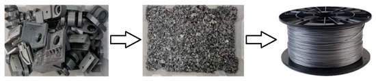 Due to the accumulation of plastic waste and its inherent negative impact on the environment, the recycling of plastics in additive production is necessary. There are currently many studies and publications dealing with this issue. We most often encounter material recycling with conventional FDM equipment. Their simple versions, which have only one print head, produce a relatively large amount of plastic waste, not just in the area of failures. Because the devices use only one type of material in their operation, the material used to support the printing of individual models has a majority share in the production of waste. Equally problematic are the filament residues, which, due to the insufficient volume, have no use in larger components. Due to the waste produced in this way, several devices are used in this technology, which enable the recycling and reuse of material. In a relatively simple cycle, the material is crushed into granules of a specific size, and then this granulate is introduced into a specialised extruder. It works on the principle of a plastic injection chamber, with the difference that the melt is not injected into the mould. The melt passes through a nozzle of a specific diameter and is then cooled and wound on a roll. We schematically see this process shown in Figure 17.