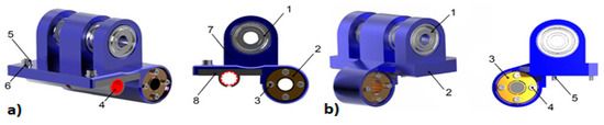 Due to the complicated solution associated with the series connection of the individual elements of the four arms located on the device. It was necessary to pay increased attention to the so-called “Trolleys” moving along a guide bar and a linear guide. They are based on a solid trolley in which all the necessary components are stored. In the case of carriages in the X and Y axes, these components include bearings of type 608 2Z (1), which are used to support the 1st stage arm (Figure 22). They also participate in its rotational motion. The construction has two components, which required increased attention in terms of their relative position and coaxial. These components, i.e., the linear ball bearing (4) and the guide nut (2), are fastened to the carriage body through screw connections (5 and 3). In the case of a linear bearing, the screw connection is realised on the housing (8) in which the bearing is located. Figure 22b shows the “trolley” of the Z and Z’- axes. Its design was modified due to the need to reduce the weight of the whole mechanism. The difference is also anchoring on the linear guide realized through M3 screws (5). The change in the type of line was necessary due to the increase required in the system’s stability and rigidity in the Z-axis, which supports the effector’s entire weight.