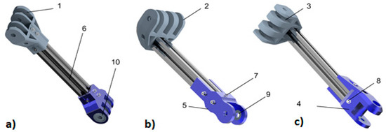 As for the connecting element, trolley in Z and Z′ axes, its design is smaller and more compact, as shown in Figure 23c. It is a more compact design due to the heavier weight of the linear guide housing, which the drive must handle during the device’s operation. The components of these structural elements are similar. Here is a ball bearing, which was replaced by a linear guide house. The trolley is attached to it through M3 screws (4). Other elements of this construction are bearings type 608 2Z, which are used to fasten the arm’s first stage using a screw and nut with an M8 thread. The last element is the guide nut (3), which ensures, as with other components, the transformation of the rotational movement of the guide screw into a sliding movement of the house along with the linear guide. The lead nut is attached to the component with M4 screws (5). The arm’s second stage in the Z and Z′ axes is substantially identical to the X and Y-axes arm. The only difference is the different orientation of the swivel joint connecting the arm to the effector. This component’s shape is then adapted so that it does not collide anywhere with the effector or other arms during movement.