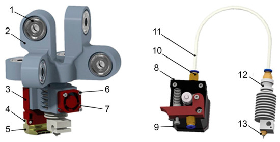The conclusion of the design is conceptual solutions of the effector and the system for material extrusion. These devices form one unit and are located at the end of the X, Y, Z and Z′ axes. The effector has six joints for the joints, which were created to verify the kinematics of the six-axis device and as support elements that would be needed when using aluminium profiles in the arms and to verify the kinematic model and possible collisions. A Bowden material extrusion system was chosen in the design to reduce the weight of the effector. It is basically a standard system with commonly available components. It is based on the Nema 17 (9) drive, which ensures the fibre’s extrusion. Extruder design that provides the pressure required to extrude the material (Figure 25). The material is moved through a pneumatic coupling (10) in which a PTFE tube (11) is fixed from the extruder. Inside, the material slides toward the print head (12). There it is heated to the desired temperature and is subsequently extruded in the form of a molten fiber through a nozzle (13). An atypical nozzle was chosen for the design, which will allow the creation of non-planar surfaces on a larger scale. The effector (2), i.e., a key component of the proposed device, consists of bearings. A movable joint is formed between the effector and the end element of the arms X and Y of the second stage after the screw connection has been formed. The bearings are positioned within the effector so that their axis is always parallel to the axis of the lead screw of the respective axis. Other elements of this printing set are fans used as standard. A 20 × 20 × 10 mm centrifugal fan (7) for cooling the passive cooling of the print head and a 40 × 40 × 10 mm axial fan (3) for cooling the layer of material on the printing pad. Both of these components are fixed to the effector body through standard screws (4, 6). The last component of this assembly is the blower used to direct the airflow under the nozzle.