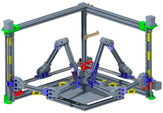 Within the methodology of design of the FDM device design, it is necessary to determine and define its required parameters and purpose. Since the work aims to design the structure focused on innovations and current trends in the industry, one of its priorities is its use. It is well known that recent trends in the use of FDM devices are different. Whether it is the use of printheads installed on robotic arms, or oversized printing used, for example, in construction, the creation of tissue through the layering of biological material, or new materials in this area, the devices used in these areas have one thing in common. They all work on the same principle of layering thermoplastic or other materials in planar layers [21]. This is based on theoretical assumptions, which form a partial solution related to the design of an atypical structure for FDM technology. Within the publication, we focus on a specific construction type, which we consider to be ideal in several ways. It is well known that compared to serial robots used in conjunction with FDM technology and conventional 3D printer designs, devices based on the principle of parallel manipulators are dominant. Due to their availability, it is relatively simple compared to robotic arms, as well as in regard to speed and dynamic movement. The disadvantage of these devices is their somewhat complicated operation compared to conventional Cartesian-type constructions and the lower achieved accuracy of component production. In the field of parallel manipulators, we know several types of constructions, such as tripod-type manipulators, also used in FDM technology devices, and various other types of constructions based on the parallel motion [22]. As part of the device’s design, i.e., developing an atypical device, we encounter a combined Cartesian-type construction with an effector characteristic of delta devices. This type of device offers new possibilities in terms of system control and the possibilities of its application. Due to the design and application of the solution to a specific type of atypical production of models, it is necessary to determine the proposed equipment’s basic requirements. Given the knowledge already gained related to structures, control, kinematics and data processing for FDM technology, we can create a list of basic requirements for creating an atypical structure [23]. These requirements are completed to develop an atypical device designed for non-planar 3D printing. Partial goals are presented, as follows: