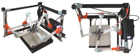 As shown in Figure 10, constructions of this type are designed to combine Cartesian-type FDM devices. Instead of a standard printhead attached to the X-axis, they have an effector similar to delta-type devices. Given the theoretical knowledge in the field of non-planar layering of material, the key is using an effector connected separately to each of the device axes [25,26,27].
