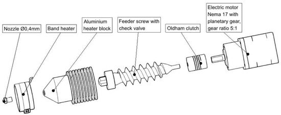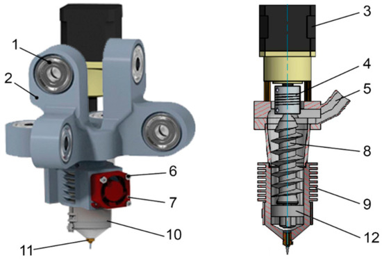 In Figure 29, we can see that the extrusion system is integrated directly into the already designed printhead. However, unlike the common components of the “Hotend” and “Bowden” system, it has a reduced version, similar to the large-capacity device used to process the granulate into a filament. The design of the structure consists of an electric motor (3), which transmits the torque to the feeder screw (8) via a flexible coupling (4). It has a check valve (12) at its end. It is designed to close when the nozzle becomes clogged or too high in the injection chamber’s overpressure to prevent the melt from running back into the printhead. A hopper forms its other parts for granulate (5), passive cooling (9) placed so as to ensure the correct course of temperatures during the extrusion of granulate or melt. The heating system (10) is located at the end of the printhead and, unlike a commonly used heater, is in the form of a hoop. It is used due to the need to achieve higher temperatures in the processing of recycled plastics. The mechanism is terminated by an airbrush nozzle (11), the shape of which is more suitable for non-planar layering of material.