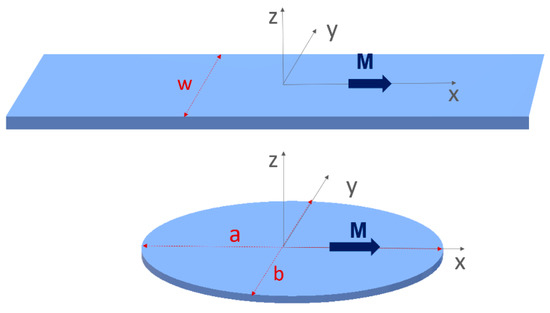 Sketch of the isolated nanoelements and of the reference frame considered in the present study: long wires and elliptical dots magnetized in-plane along the easy direction, coincident with the x-axis. The z-axis is perpendicular to the plane.