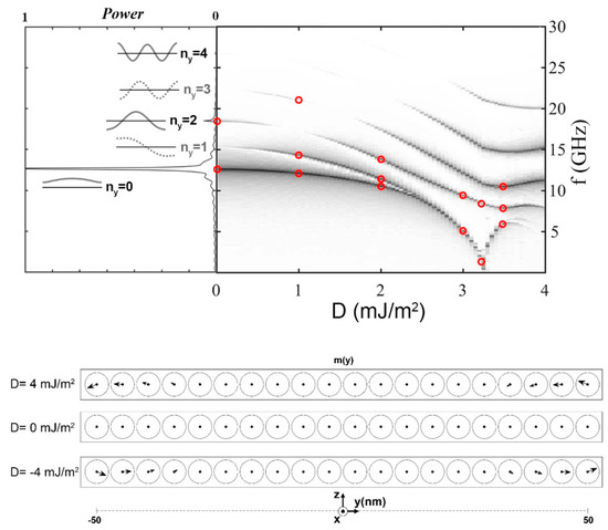 It can be seen that for D = 0 only the even modes have a finite cross section in the spectrum, while odd modes are absent, as anticipated in the previous section. However, as D is lifted from zero, also odd modes become visible, since they progressively lose their stationary character along the y direction, reflecting the fact that the DMI introduces an energy shift proportional to ±Dky for each of the two partial waves, travelling in opposite directions, whose superposition gives rise to the stationary mode at D = 0. The detailed time evolution of the spatial profile of all the modes and their evolution with the value of D can be found in the animations (MP4 video files) that are available in the Supplementary Material. These animations clearly show that for finite values of D the modes assume a propagative character along the y-direction and the position of the nodes is not fixed at specific positions anymore, but it shifts to the right with time. As a consequence, also for those odd modes that were absent in the spectrum at D = 0 there is net magnetic moment oscillating that can be resonantly coupled to the spatially uniform oscillating magnetic field. This is the reason why, for instance, the intensity of the first two odd modes (ny = 1 and ny = 3) is zero for D = 0 but becomes relatively large as D is lifted to 1 or 2 mJ/m2, as seen in Figure 2. Another interesting point is that the frequency of all the modes decreases on increasing D, but the slope of the ny = 1 mode is larger than that of the fundamental mode (ny = 0), so the two modes merge for D ≈ 2 mJ/m2 and become soft for D = 3.25 mJ/m2, driving the transition from the uniform ground state to a chiral one, similarly to what happens in magnetic dots when there is a transition in the ground state [28,29]. To this respect, we verify also in the present case a characteristic that was previously observed for magnetization reversal of magnetic dots: whenever there is a change in the symmetry of the equilibrium state, which change is consistent with the symmetry of the mode that becomes soft and that drives the transition to a new ground state. The change of the ground state after the mode softening is illustrated in the bottom panel of Figure 2, where we have plotted the static magnetization across the stripe for D = 0 and for D = ±4 mJ/m2. One can easily see that for D = 0 the magnetization of all the discrete cells is aligned along the x direction, while for D = ±4 mJ/m2 the magnetization of the cells that are close the edges of the stripe deviate from the x direction and assumes a chiral configuration, with opposite chirality for positive or negative D. Remarkably, one sees that the z-component of the corresponding cells located at either the left or the right side of the stripe is opposite, resembling the antisymmetric nature of the ny = 1 mode, which is, in fact, the mode undergoing softening. Notice that if the magnetic system would be made more rigid by a larger applied field, then the value of D for which the mode softening occurs (D = 3.25 mJ/m2 in the present case) would be larger. For instance, it would be lifted to D = 3.65 mJ/m2 by doubling the intensity of the external field (B0 = 0.2 T rather than 0.1 T). Another interesting characteristic of the modes evolution with D is that only the modes with indices ny larger than 1 do not soften, because the presence of more than one node in their transverse profile implies a relatively large cost in terms of exchange energy and this prevents their frequency to approach zero.