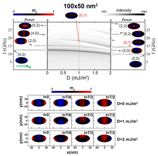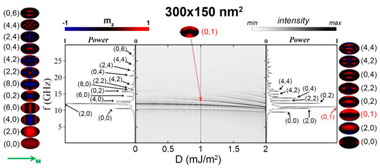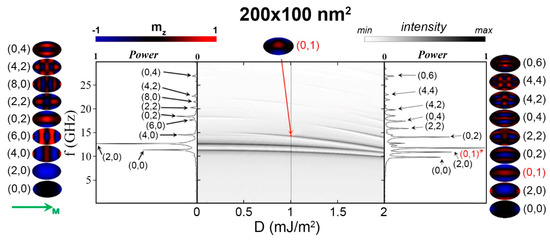 Let us now consider the more complicated case of elliptical nanodots, which, different from the wires discussed above, are laterally confined in both in-plane directions. For such case, we adopt the classification and the labelling scheme of the eigenmodes of magnetic nanodots that have been described in a recent review paper [30]: each mode is labelled with two integer indices (nx,ny) whose values correspond to the number of nodal lines perpendicular or parallel to the direction of the magnetization (x axis), respectively. In Figure 3 one can see the results of our simulations relative to the smallest dots considered in this study, having lateral dimensions 100 × 50 nm2. The central panel shows the evolution of the mode frequencies as a function of D, while in the left- and right-hand panels one finds the intensity spectra where each peak corresponds to the mode whose bidimensial spatial profile is shown in color scale. In this first approach we limit our analysis to the range of D between 0 and 2 mJ/m2, i.e., a range of values that are easily accessible in real samples [19].