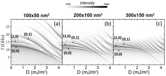 To conclude, let us notice and interesting aspect connected with the eigenmodes intensity at relatively large values of D, which is easily seen in Figure 6. As D overcomes the values of about 2 mJ/m2, there is a clear evolution of the modes intensity. In particular, one sees that the character of “fundamental mode”, i.e., the largest intensity, is not anymore related to the (0,0) or (2,0) modes at lower frequencies. Rather, one finds that modes with relatively high-order assume a considerable intensity, while the soft mode at low frequency becomes less intense. For instance, for D between 3.5 and 4 mJ/m2 the spectrum is dominated by modes between 15 and 20 GHz. Such a lift of the frequency of the modes with the largest intensity under external excitation by a uniform field pulse for large values of D could be in principle exploited to achieve high-frequency operation in devices exploiting ferromagnetic resonance or microwave-assisted switching of magnetic dots.