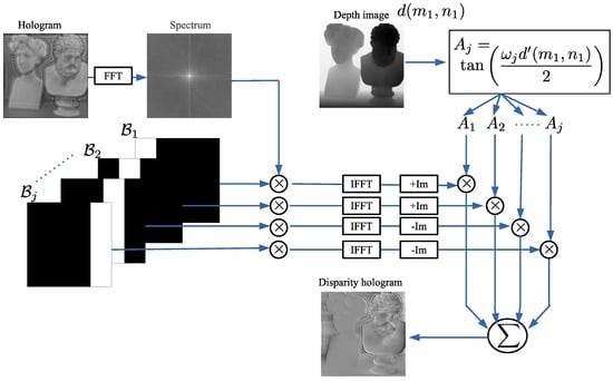 Figure 1 shows the outline of the proposed method. First, We generate a hologram from 3D scenes with an RGB image and depth image using Equation (1); subsequently, we generate a disparity hologram from the calculated hologram using Fourier band-pass filtering. By adding or subtracting the disparity hologram to the calculated hologram, we obtain new holograms viewed at a right or left position. The newly generated holograms do not experience computational complexity because it requires only addition or subtraction operations. As the number of the bands increases, we obtain finer motion parallax.