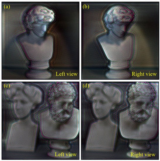 Figure 3 shows the numerically color-reconstructed images from motion parallax holograms from left and right view positions. They are complex amplitude holograms [12]. We used the 3D model provided from [19]. We simply calculated the color holograms by applying Equations (1), (3) and (4) for red (633 nm), green (532 nm) and blue (430 nm) wavelengths, respectively. The resolution of holograms is pixels. The pixel pitch of the holograms is 10 μm. The near and far distances of 3D scenes are 3 and 5 cm from the holograms, respectively. It is an image hologram setup [21]. We used this setup to confirm the effectiveness of the proposed method, but the proposed method works well at long distances as well. Figure 3a,b show the reconstructed images of “Antinous.” We confirmed that the proposed method can generate motion parallax from left and right views. Likewise, the proposed method can generate motion parallax of reconstructed images of “Greek,” as shown in Figure 3c,d.