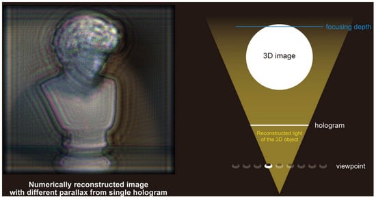 Additionally, likewise Figure 4, we present three videos in the Supplementary Section (Video S1: reconstructed video of “antinous,” Video S2: reconstructed video of “Greek,” and Video S3: reconstructed video of “Papillon” whose original 3D scene are provided in [22]) to confirm the effectiveness of the proposed method. These videos present reconstructed images with motion parallax using the proposed method, while continuously changing the viewing positions and reconstruction focuses.