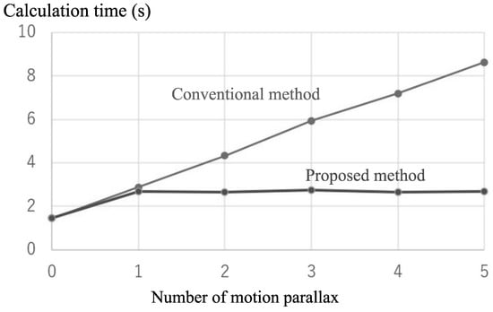 Calculation times of the proposed method and the conventional method as functions of the number of motion parallax.