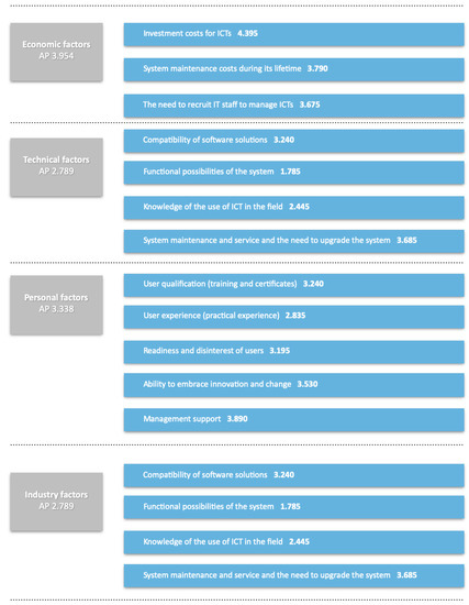 It is essential that these findings and the main research hypothesis are confirmed using the Kruskal–Wallis test. An overview of groups of factors shows that the most important are economic factors. Personal factors are also significant. Overall, the setting of people (employees) to accept change, and accept innovation and their skills and knowledge in the IT field, significantly affect the implementation of ICT in the cycle cost management of construction and construction projects. Based on the Likert scale and Kruskal–Wallis testing, an infographic was constructed that highlights the importance of individual factors for specific groups and provides information about the arithmetic mean for individual implementation groups (Figure 1).
