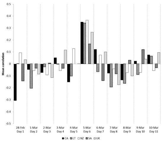 | 10-March | −0.38 * | −0.12 | −0.15 | −0.02 | −0.23 | 0.28 | 0.05 | −0.15 | −0.21 | −0.05 |