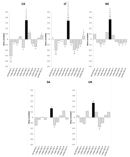 | 5-March | −0.66 *** | −0.40 * | −0.42 *** | −0.3 | −0.50 *** | −0.23 | −0.43 * | −0.49 ** | −0.33 | −0.28 | |