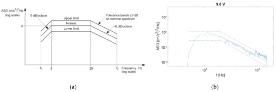 (a) Shape of acceleration spectral density according to IEC 61373. (b) Acceleration spectral density as measured in our setup with an RMS output voltage of the amplifier of 9.6 V.