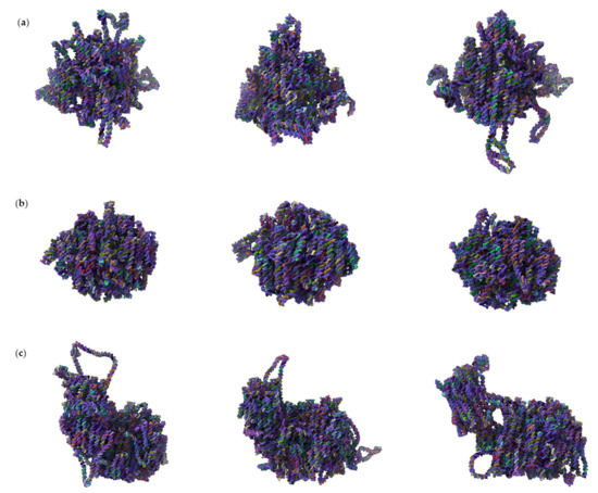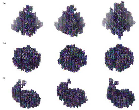 - Poppleton, E.; Bohlin, J.; Matthies, M.; Sharma, S.; Zhang, F.; Šulc, P. Design, Optimization and Analysis of Large DNA and RNA Nanostructures through Interactive Visualization, Editing and Molecular Simulation. Nucleic Acids Res. 2020, 48, e72. [Google Scholar] [CrossRef]