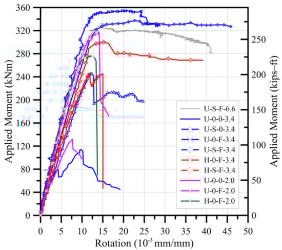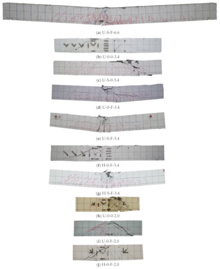 For test specimens with shear span to depth ratio of 3.4, the mode of failure was determined depending on the steel fiber inclusion. Two specimens, U-0-0-3.4 and U-S-0-3.4, which used the 200-0 matrix, showed expanded diagonal shear crack and spalling of web area, respectively, as shown in Figure 5b,c. As shown in Figure 5d, in the case of ultra-high strength concrete specimens reinforced with steel fiber, diagonal shear cracks were observed, but these cracks were not expanded, and the maximum load applied to the specimen was observed with crushing of concrete at compression fiber of beam center. Therefore, the failure pattern of this specimen was defined as flexural failure. Specimen U-S-F-3.4 also showed a similar crack pattern with U-0-F-3.4, as shown in Figure 5e. The test specimens using 100-F matrix without stirrups, H-0-F-3.4 failed with the expansion of diagonal crack. On the other hand, H-S-F-3.4 was failed with crushing of compression region at beam center. Therefore, it was confirmed that failure modes were changed by shear failure and flexural failure due to the installation of the stirrup. It was confirmed that the specimens with a shear span ratio of 2.0 were destroyed by the occurrence and diffusion of diagonal cracks connected between the loading point and the supporting point and the increase of the crack width. When the steel fiber was not reinforced, the fracture occurred due to the diffusion of the cracks in the diagonal direction. It is judged that the incorporation prevents the longitudinal destruction of the strut and causes an increase in strength. Table 5 summarizes the strength with the first yield of tensile flexural reinforcement and ultimate strength with corresponding rotational angle.