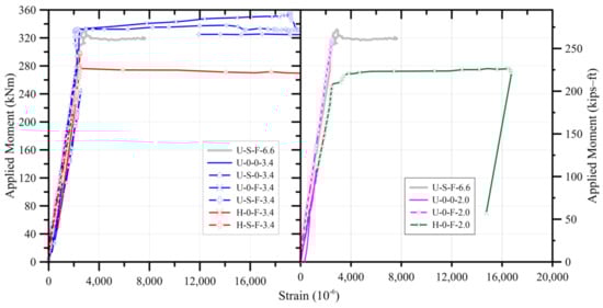 Figure 6 shows the tensile flexural reinforcement strain at the center of the beam with a shear span to depth ratio of 3.4. All of the above-mentioned flexural failure type specimens experienced yielding of the flexural reinforcement, and shear failure type specimens showed the elimination of stress in the flexural reinforcement after experiencing maximum strength. The test specimens with a shear span to depth ratio of 2.0 were a shear failure due to the diagonal shear crack width expansion, as shown in Figure 5. However, as a result of examining the flexural reinforcement strain, the flexural reinforcement of the specimen H-0-F-2.0 was yielded, as shown in Figure 6.