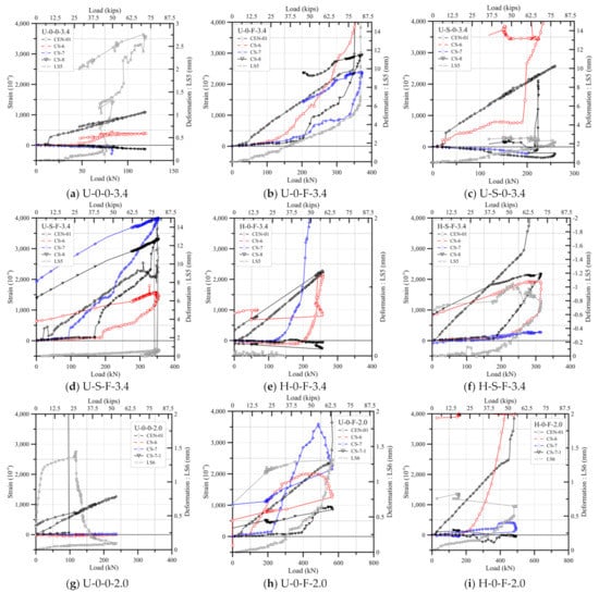 According to Figure 7a, which is the strain distribution of the specimen U-0-0-3.4, it was found that all strain gauges had a smaller amount of strain than other specimens and the tendency to return to the state before the loading after the maximum load experience appeared. This phenomenon occurred because the strain gauge did not pass through the crack surface. The diagonal section’s deformation amount was continuously increased even after the maximum load manifestation could be classified as a shear failure. It was also confirmed that the location where the deformation amount of LS5 rapidly increased was similar to the time of the crack in the diagonal direction. Figure 7c also showed this phenomenon as it is. However, in U-S-0-3.4, as reinforcement by shear reinforcement was performed, the crack angle appeared close to 45 degrees, and it could be confirmed that the strain of the corresponding gauge increased rapidly by passing through the CS6 strain gauge. The two specimens reinforced with steel fibers showed that, unlike the two specimens that were not reinforced with steel fibers, there was no sharp increase in the diagonal strain or the amount of deformation, but gradually increased. When a high-strength matrix was used, as shown in Figure 7e, it was confirmed that it belongs to shear failure as the expansion of the cracks in the diagonal direction was clearly seen even when reinforced with fibers. At this time, by reinforcing with shear reinforcement, it can be confirmed that the failure pattern was changed to a flexural failure pattern.