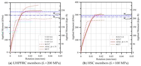 Figure 8 shows the results of the moment-rotation angle relationship of the specimen and the sectional analysis derived using material models suggested by AFGC, KICT, and KCI. As a result of the analysis using the stress-strain relations, it was confirmed that the initial stiffness is higher than the experimental results. However, the initial stiffness was not considered in this study because the initial stiffness degradation may be caused by the initial crack at the stirrup position, which is frequently encountered when an ultra-high-strength matrix is used.