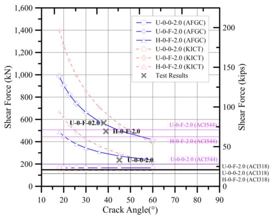 In order to evaluate the shear strength equations for the reinforcing effect of steel fiber, test specimens with a shear span to depth ratio of 2.0 were examined. As shown in Table 10, the predicted value was much smaller than the tested value. Especially, it is confirmed that this tendency is more prominent when reinforced with steel fiber. This was the case in both the AFGC and KICT design recommendations. This phenomenon was confirmed as a phenomenon occurring because the angle was evaluated at 45 degrees in this study. However, design recommendations consider the crack angle and principal stress angle as the effect of the shear span to depth ratio. Therefore, the crack angle of each specimen was measured to consider the effect of the crack angle. In U-0-0-2.0, which is not reinforced by steel fiber, the crack angle close to 45 degrees was measured in the web center. The U-0-F-2.0 and H-0-F-2.0, which were reinforced with steel fiber, had crack angles of 38 degrees and 39 degrees at the center of the web. Figure 9 illustrated the calculated shear strength and experimental results of the specimens with a shear span to depth ratio of 2.0. According to Figure 9, AFGC showed high accuracy when applying the relationship between the crack angle and the shear strength contribution of steel fiber.