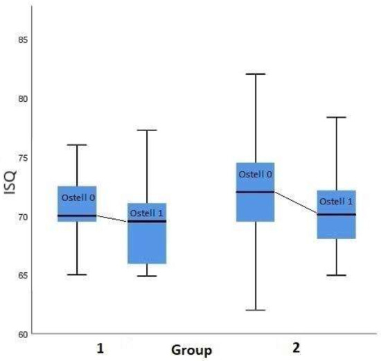 The hydrophilic surface implants modified with hydroxyl ion have been assessed for primary and secondary stability only in two other studies to date. Primary stability in the mentioned studies’ plants amounted to 57.3 (±7.4) ISQ and raised to 71.3 (±8.2) ISQ while loading [