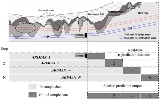 We simulated WF based on ARIMAX in consideration of both geological parameters and previous TBM operating parameters. Two actual projects with different construction conditions were selected to test the performance of the method. For comparative analysis, the proposed method was compared with non-time series OLS. Additionally, the prediction of current thrust was examined depending on the real-time prediction distance to validate the practical applicability. The simulation results showed that the ARIMAX outperforms the OLS predictor in both projects. As for the analysis according to the real-time prediction distance, the results showed that time series-based ARIMAX provides meaningful results where the real-time prediction distance is under 8 rings (11 m) or less. Such a time interval gives enough time for TBM operators to make decisions. The WF based on ARIMAX can provide reasonable TBM operating conditions with time-varying data. Of course, there remain several challenges such as outlier processing for in situ data and consideration of the operator’s driving skills. Nevertheless, this study is expected to be used as an important reference for the development of predicting various operating parameters in the future.