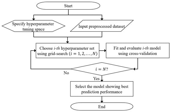 The prediction model based on ARIMAX should be optimized automatically in every WF step to implement the WF. In accordance with this need, we develop an algorithm for model construction without the help of any human judgment (Figure 2). In the first stage, the tuning space of hyperparameters p, d, q, and r pertaining to ARIMAX must be specified. Giving a dataset to the algorithm, the i-th (i = 1, 2, …, N) hyperparameter set chosen from grid-search is used for model training. This process is repeated until N candidate models are built. Among N models, only the one with the lowest Akaike information criterion (AIC) [22] is finally selected as the predictive model.