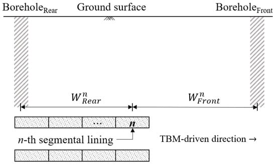 In this study, a weight parameter expressed by a distance for the n-th segmental lining was introduced (Figure 3). The two weight parameters can be quantified as the distance between two adjacent boreholes from the n-th segmental lining position. The weight parameter makes it possible to retrieve both boreholes’ information for the n-th segmental lining. Using this parameter, we augmented the dataset with output (thrust) and input parameters, as summarized in Table 3.