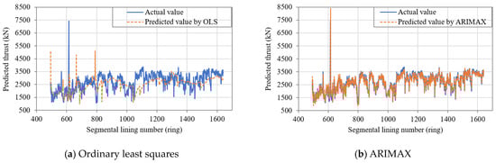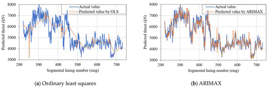 Figure 4 and Figure 5 show the prediction results in projects A-1 and B-2, respectively. As shown in Figure 4, the ARIMAX predictor outperformed the non-time series-based ordinary least squares (OLS) predictor in project A-1. This phenomenon can also be seen in project B-2 (Figure 5). These results imply that the previous input values used in ARIMAX provide meaningful information for predicting the values of current thrust, and that the thrust has time-varying features.