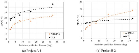 Figure 4 and Figure 5 are the prediction results under the condition that the real-time prediction distance (out-of-sample size) is one segmental lining. For practical applications, an additional analysis was performed according to the real-time prediction distance (Figure 6). As the real-time prediction distance increases, the MAPE (%) also increased logarithmically in both ARIMAX and OLS. As for the comparison between the two predictors, the ARIMAX outperforms OLS regardless of the real-time prediction distance in project A-1. The result in project B-2 also showed a similar trend, but when the real-time prediction distance is more than 8 rings, the performance for the ARIMAX began to be lower than the performance of OLS. The output of the ARIMAX predictor is dependent on time series, whereas OLS is not. If the real-time prediction distance increases, that of the future period to be predicted will also increase, which means ARIMAX does not guarantee a higher prediction accuracy in a longer future period. Based on the experimental tests with the two projects, it can be interpreted that time series-based ARIMAX provides meaningful results where the real-time prediction distance is under 8 rings for practical application.