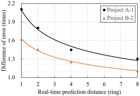 To compare the relative performance between WF based on ARIMAX and OLS, we calculated the difference in error in the unit of times (Figure 7). When the real-time prediction distance is 8 rings, the ARIMAX outperformed OLS by approximately 1.3 times in project A-1, and 1.1 times in project B-2. As the real-time prediction distance gradually decreased from 8 rings, the difference in error showed increasing patterns in both projects. The distance of 8 rings corresponds to about 10 m (1.2 m/ring), and such a time interval gives enough time for TBM operators to make a decision. However, a universal value for allowable real-time prediction distance cannot been specified because it varies with the project’s conditions. Accordingly, this value (11 m) can be used only as a reference, and application to more projects would be needed to approximate the universal value.