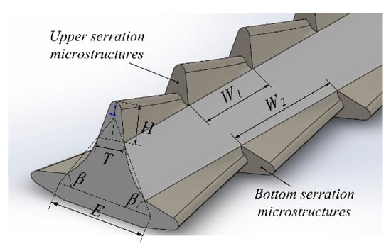 Figure 1, serration microstructures at the bottom of the leading edge were larger than the upper ones in size. Moreover, they both decrease gradually from the wing root to the tip in width along the spanwise direction. As a result, further studies need to focus on quantitative microstructure-related parameters. The regular triangle edge height