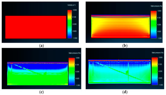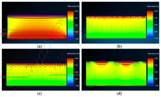 Pressure nephograms of different bionic wing surfaces: (a) basic wing, (b) wing k, (c) wing m and (d) wing o.