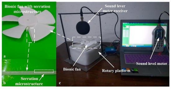 Figure 10 included a self-built low-noise rotary platform, a bionic fan with a microstructure blade, a multifunctional sound level meter system and a computer. In order to reduce noise and resistance as much as possible, the microstructure carrier was designed in the form of a blade, which was fabricated by 3D printing technology. Moreover, the windward surface was rectangular and easy to fix the microstructure. The microstructure was fixed on the windward side of the blade by glue, which was called the bionic blade. The noise measurement range of the multifunction sound level meter was 20–132 dB, A/D digits were 24 bits, the sampling frequency was 48 Hz, and the frequency range was 100–2000 Hz. The rotating speed range of the low noise rotating platform was 0–5000 RPM, and the overall sound pressure level range of noise was 30.5–41.2 dB. The sound level meter receiver fixed at 10 cm above the center of the fan blade receives pressure fluctuation caused by air when the fan rotated.