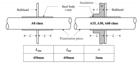 The A60 BPP, which is installed on ships and offshore plants, is a fire-resistance apparatus used for the safe operation of control and communication cables and connected through the vertical bulkhead structure while maintaining airtightness in case of fire accident in the bulkhead compartment. Figure 1 shows the design specifications for bulkhead penetration pieces specified in the international ship classification regulations [15], according to the fire-resistance ratings.