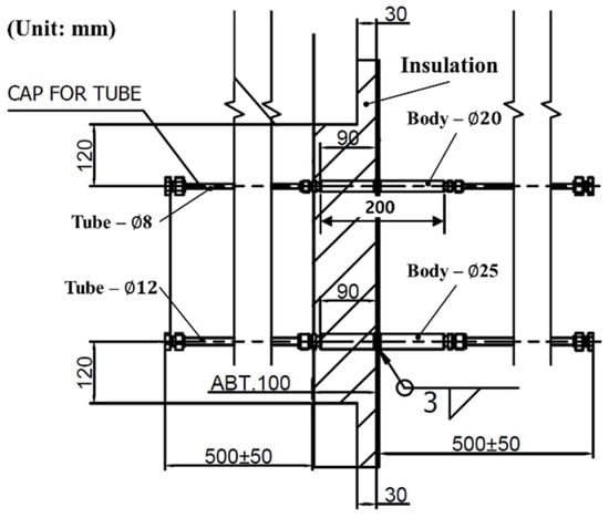 As represented in Table 3, the levels for the length of the body were defined as 50 mm intervals. The levels for the diameter of the tube were set to ϕ6, ϕ8, and ϕ12 considering the diameter specifications of steel tubes that can be actually manufactured. Since both the S45C and the SUS316L were conventionally used for the fire-resistance apparatus made of steel category were, the material type of A60 BPP was set to the two-level design variable. The levels for the insulation density were set to 96, 128, and 160, considering the insulation specifications that have been actually used for the A60 class insulation.