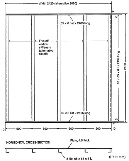 As shown in Figure 3, the fire test specimen of A60 BPP should be made of a general steel structure material (SS400). For the rectangular plates with the width of 2440 mm, the length of 2500 mm and the thickness of 4.5 mm, L-shaped stiffeners with dimensions of 65 × 65 × 6 mm should be placed at 600 mm intervals. The A60 BPP was mounted with the insulation between the L-shaped stiffeners of the specimen, as shown in Figure 3, and the fire-resistance performance was verified through the fire test. For the fire test specimen equipped with both A60 BPP and the insulation, the side of the insulation should be placed on the opposite side of the furnace inside in order that the specimen can be evaluated in the same manner as operation condition in the actual ship. In addition, the specimen was mounted vertically in the furnace and heated gradually to the temperature of 940 °C for 60 min.