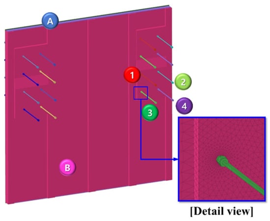 In the transient heat transfer analysis of the A60 BPP, the maximum temperature and contour were calculated using ABAQUS/implicit [16], a general-purpose finite element analysis program. The transient heat transfer analysis model generated based on both the design configuration of the A60 BPP in Figure 2 and the fire test specimen in Figure 3 is shown in Figure 4, and the detailed specifications of the analysis model are summarized in Table 1.