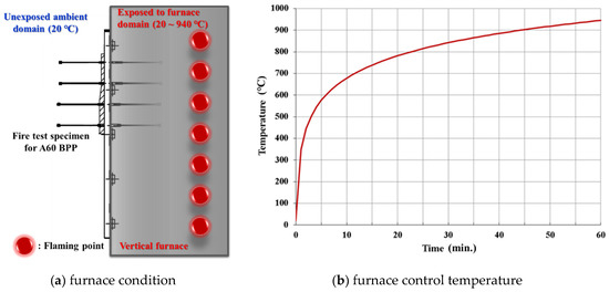 As shown in Figure 5a, the fire test specimen for A60 BPP was installed in the vertical direction, and the side of the insulation was placed on the opposite side of the furnace inside. The enclosed internal temperature of the fire test furnace was heated up to 940 °C for 60 min according to the furnace control temperature curve with the heat at the flaming point. The furnace control temperature curve shown in Figure 5b is defined by the following equation [2]: