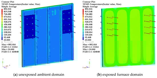 As shown in Figure 6, the temperature results of the A60 BPP measured in the unexposed ambient domain were distributed in the range of 20 °C to 313 °C, while in the exposed furnace domain, they were distributed in the range of 330 °C to 892 °C. Based on the numbers represented in Figure 4 and Table 1, the maximum temperature results on the body of the A60 BPP in the unexposed ambient domain were measured as 172.4 °C at #1, 76.6 °C at #2, 170.0 °C at #3 and 58.4 °C at #4, respectively. It was found that the temperature result of the newly devised A60 BPP from the transient heat transfer analysis satisfied the fire-resistance temperature limit for the A60 class apparatus regulated in the FTP code.