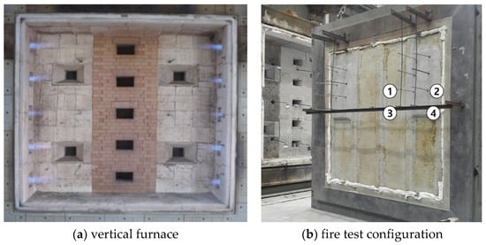 In order to verify the transient heat transfer analysis result, the fire test specimen was manufactured in accordance with the FTP code in the same way as the analysis model, and the test was carried out according to the international fire-resistance test procedure specified in ISO [10]. The vertical furnace, which is used for the verification of fire-resistance performance of the A60 BPP, is a facility that tests the A-class vertical fire protection apparatus installed at the vertical bulkhead compartment in ships and offshore plants. The effective heating area of the vertical furnace is 3000 mm × 3000 mm. The fire test temperature inside the furnace is controlled according to the furnace control temperature curve of Equation (1) through the flame from burners installed on the lower side of the furnace. The fire test time is adjusted according to the fire-resistance class. The vertical furnace facility and the test configuration used for the fire test of A60 BPP are shown in Figure 7.