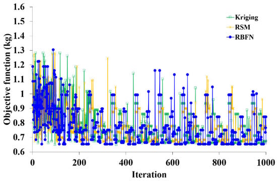 The approximate optimal solution result was explored by applying the meta-models of Kriging, RSM, and RBFN to the discrete design ranges defined in the process of formulating the optimal design of A60 BPP. The accuracy of the approximate optimal design result was compared with the results of the actual constraints for each meta-model. The optimization results are summarized in Table 7 for the optimal design solution, the approximate and actual calculation results of the constraints, and the weight minimization results. The results of the optimization convergence of the objective function are shown in Figure 9.